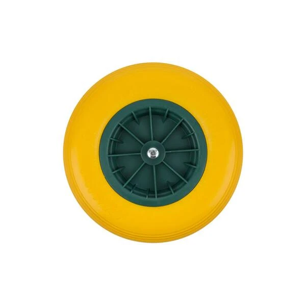 Dit gele kruiwagenwiel met as is een volle band waarbij je nooit meer voor verrassingen komt te staan bij de start van je kluswerk. Door de volle structuur van de band rijd je nooit meer lek.